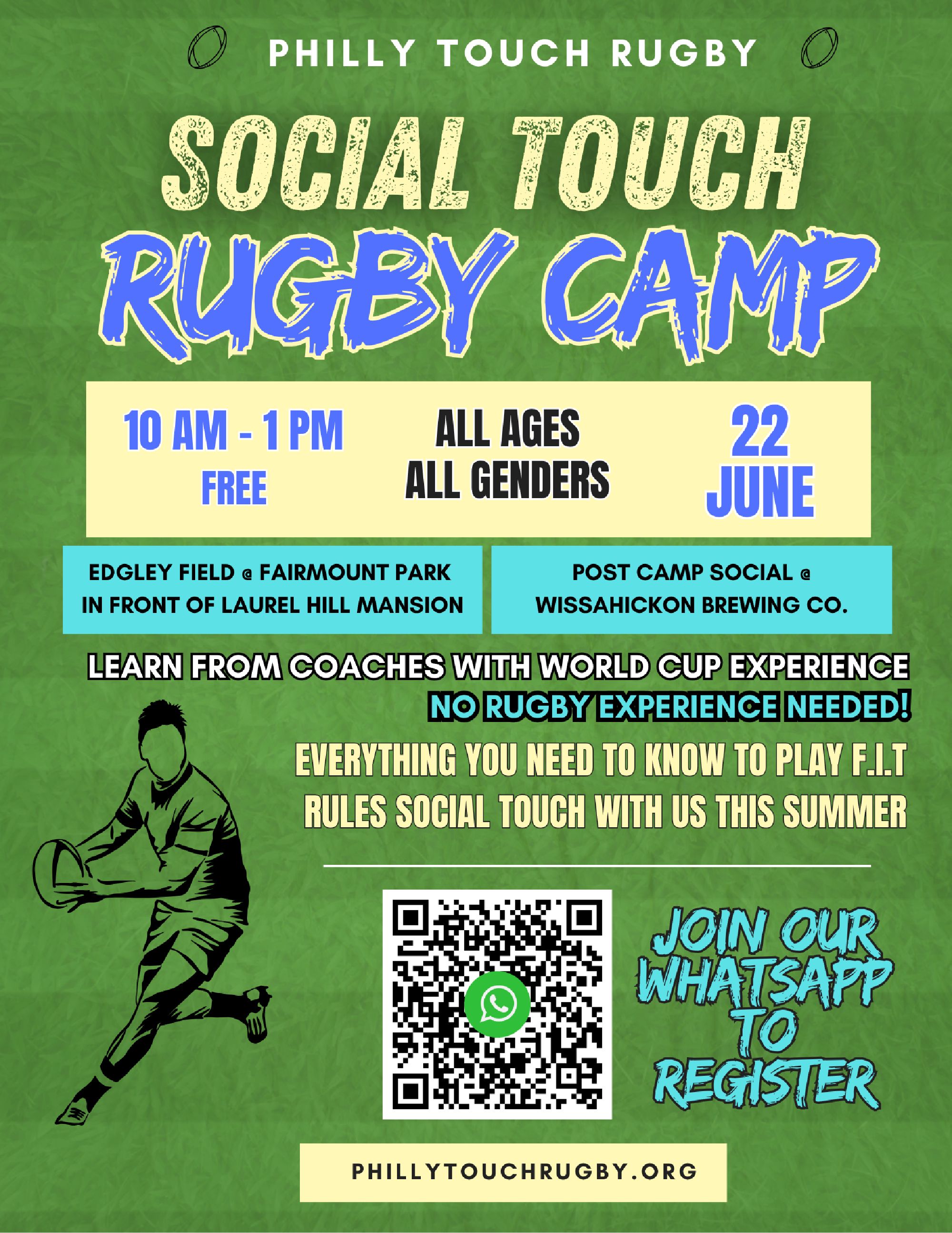 Are you looking for a fun, fast-paced new sport and a cool group of people to hang out with? Come join our touch clinic on Sunday, June 22nd and Edgley Field in Fairmount Park. We will go over the basics of rucking, scoring and defence.